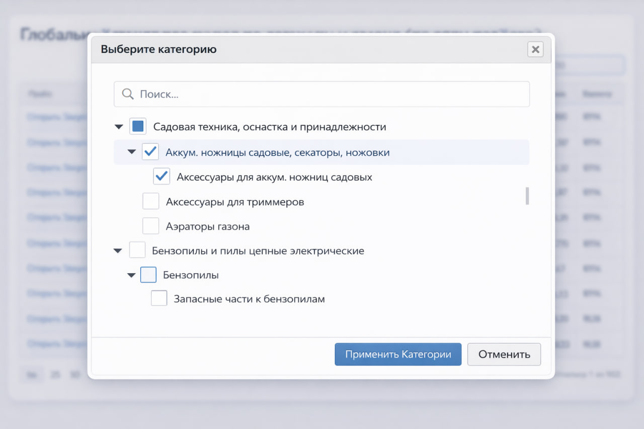 - выбор нужных категорий осуществляется с помощью чекбоксов в дереве категорий